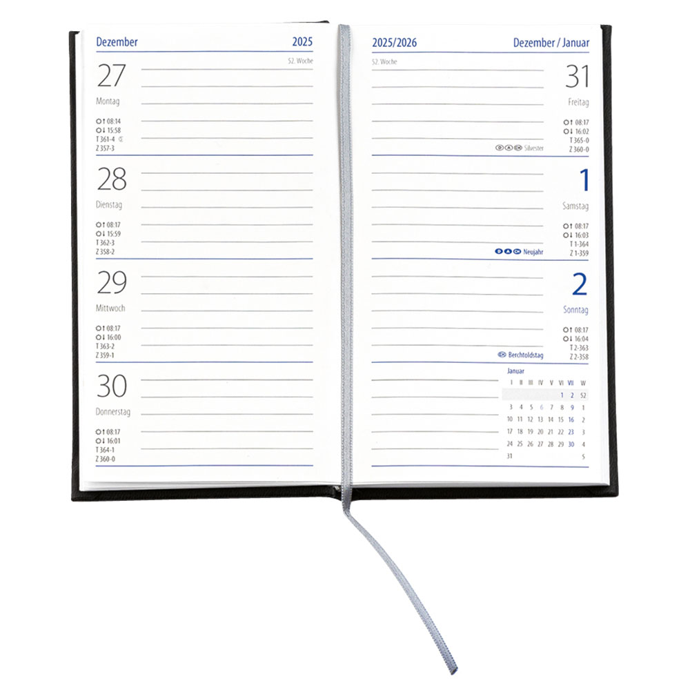 Tages- und Zinszählung Ferientermine D/A/CH Jahres- und Monatsübersichten Monatsvor- und -nachlauf Tageszählung Sonnenauf- und -untergang Große Auswahl an verschiedenen Einbandmaterialien und Farben |